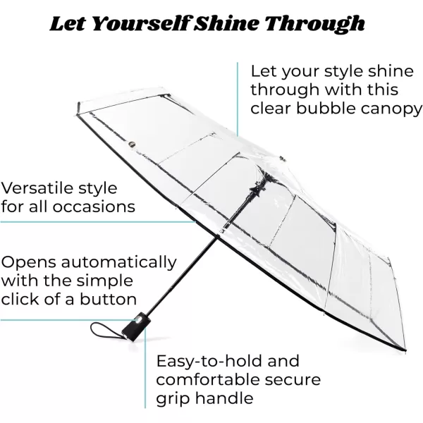 Get a bright view on those grey days with the totes ultra clear automatic open close folding umbrella. Enjoy protection from wind and rain with this 42-inch ultra-clear canopy – totally see-through coverage that shields your hair and makeup from the elements. Easily navigate busy city streets with a canopy that won't obstruct your vision of people passing by. Automatically opens with the touch of a button keeping one hand free when you're on the go. The ergonomic rubber coated handle, wrist strap, and sleek black canopy trim make this umbrellathe perfect rain accessory for women of all ages and lifestlyes.